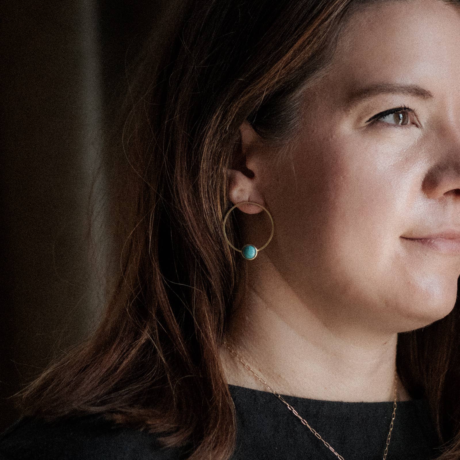 This set of earrings features a bezel set turquoise stone on a hand hammered circular brass hoop. All soldered by hand and connected to sterling silver stud posts.