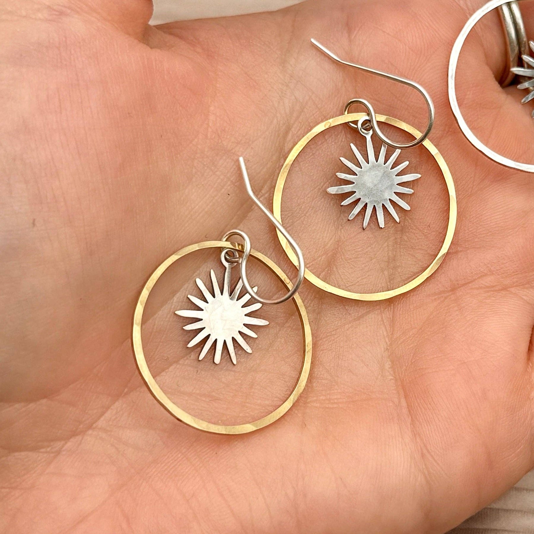 Gold hoop and star pendants that hang from handmade sterling silver ear wire. Ear wires are hypoallergenic and are sterling silver filled. Gold and silver pendant pieces are made of raw brass or sterling silver plated brass and can be polished the same as all other precious metals.