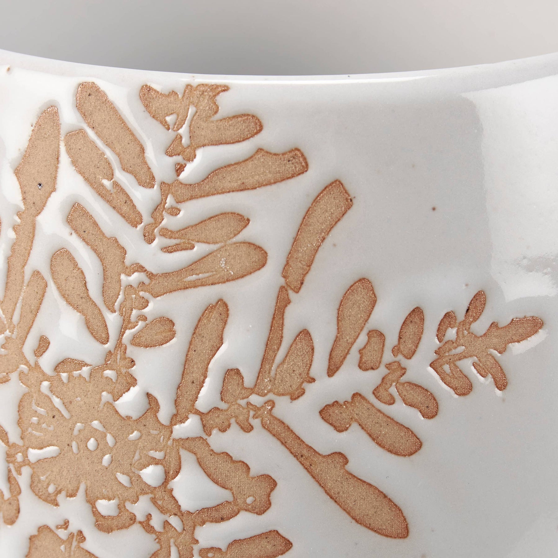 Cozy up with a warm beverage and this beautiful snowflake mug. This mug features a snowy cream color with a natural debossed snowflake and bare ceramic detail on the base. Microwave and dishwasher safe.