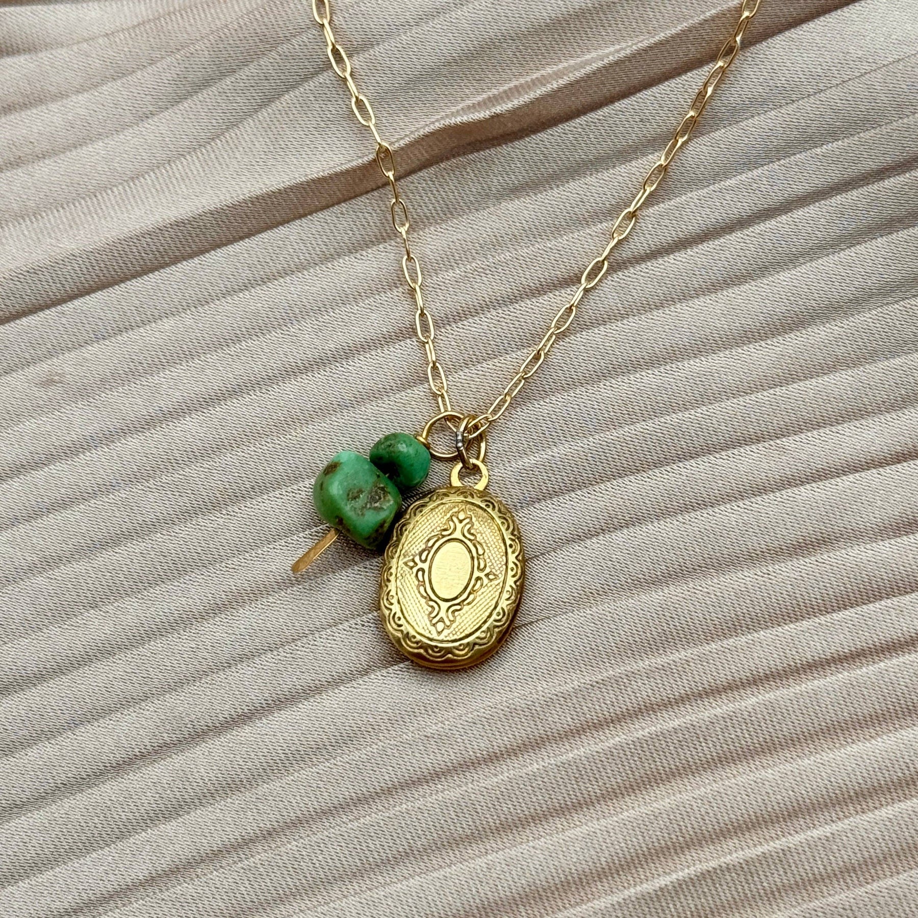 The Capsule Necklace features a detailed locket paired with natural turquoise chip beads. Designed to hold a secret, a memory, or a tiny treasure. Hangs freely on a 14k gold fill chain.