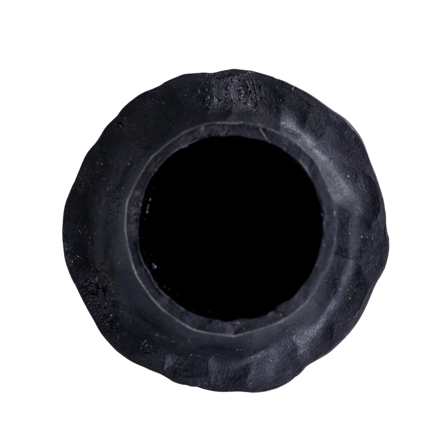 Stylishly designed, this hand-forged, metal taper candle holder has black finish. An imperfect texture gives it a unique appearance. Display with similar complementary pieces or as a stand-alone piece.