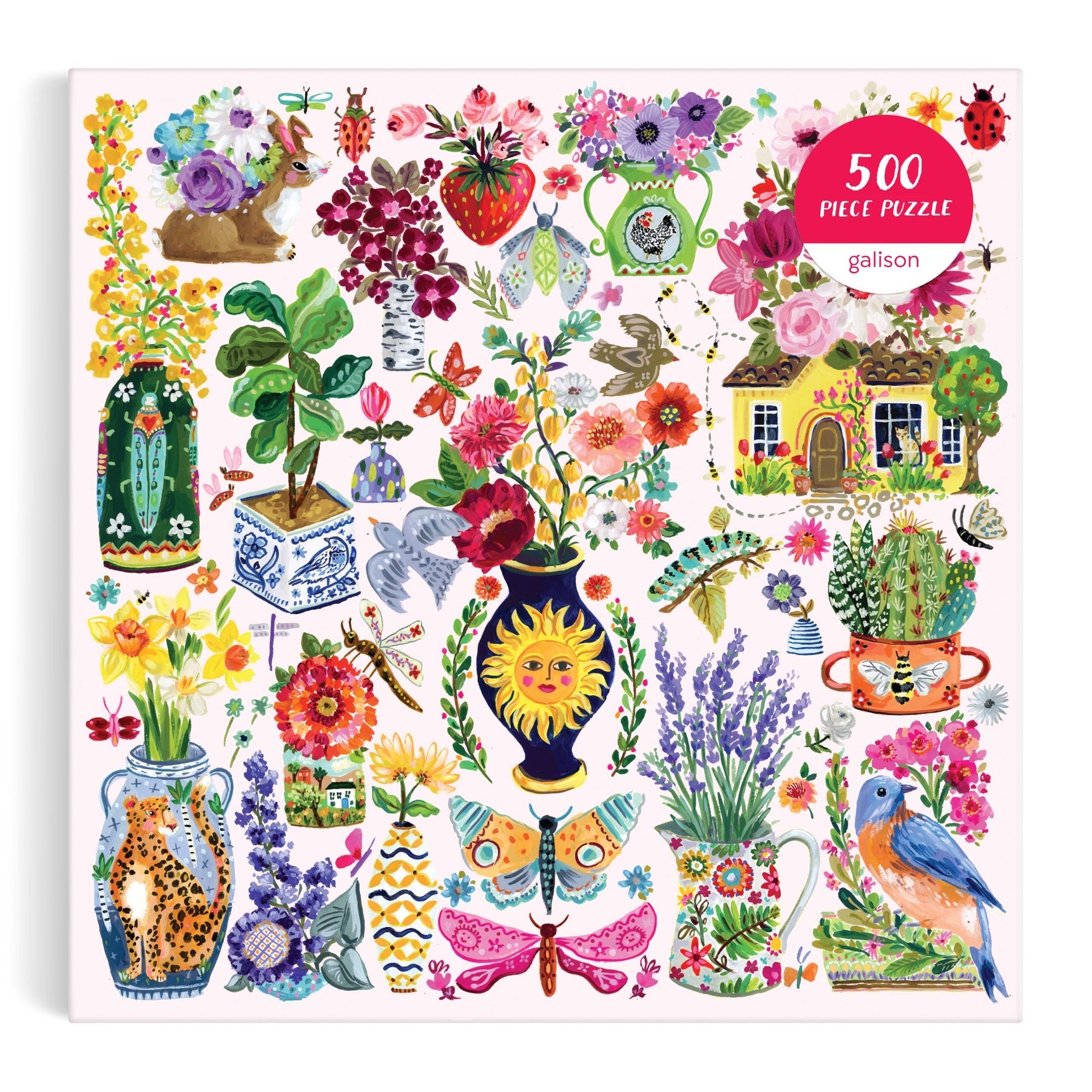 Enter a world of whimsy and wonder with August Wren's enchanting 500-piece puzzle featuring artwork of a delightful collection of painted flowers in beautiful vases, accompanied by fluttering butterflies and adorable little animals. Each piece of this puzzle is a charming tableau, capturing the vibrancy of nature and the playful interactions of its inhabitants.