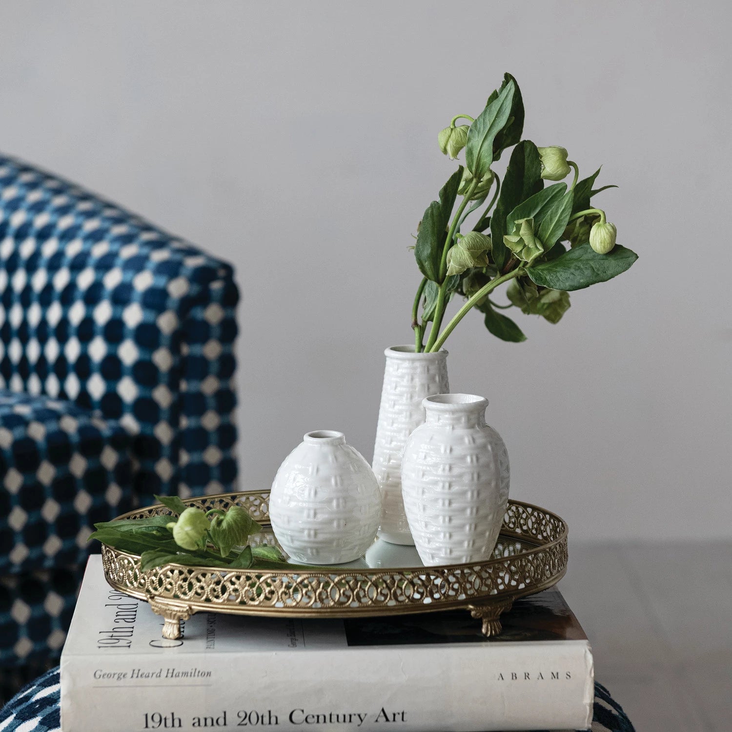 A beautiful piece to hold your treasures! Crafted from cast aluminum in a sweet floral cutout pattern and antique gold finish. Use to hold toiletries in the bathroom, or to hold a candle or vase on a table.