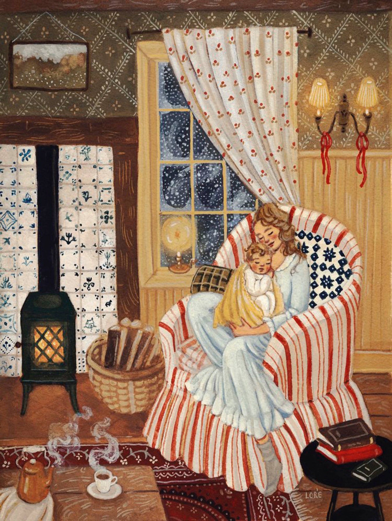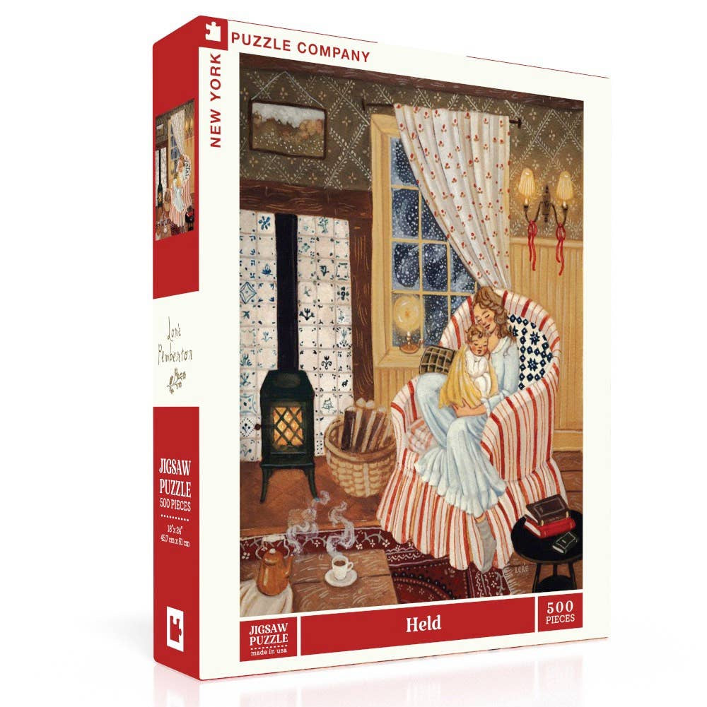 Wrap yourself in the warmth of a quiet winter night with Held, a 500 piece jigsaw puzzle by beloved New England artist Loré Pemberton. This tender, intimate scene captures a young mother cradling her infant in the soft glow of a cozy cottage, offering a serene moment of comfort, love, and connection. Inside, the woodstove glows with gentle warmth, casting a golden light across the room. Candles flicker and a fresh kettle of tea sits ready, adding to the peaceful, homey atmosphere. Outside, snow falls softly, blanketing the night in calm and quiet—a perfect contrast to the snug world within.