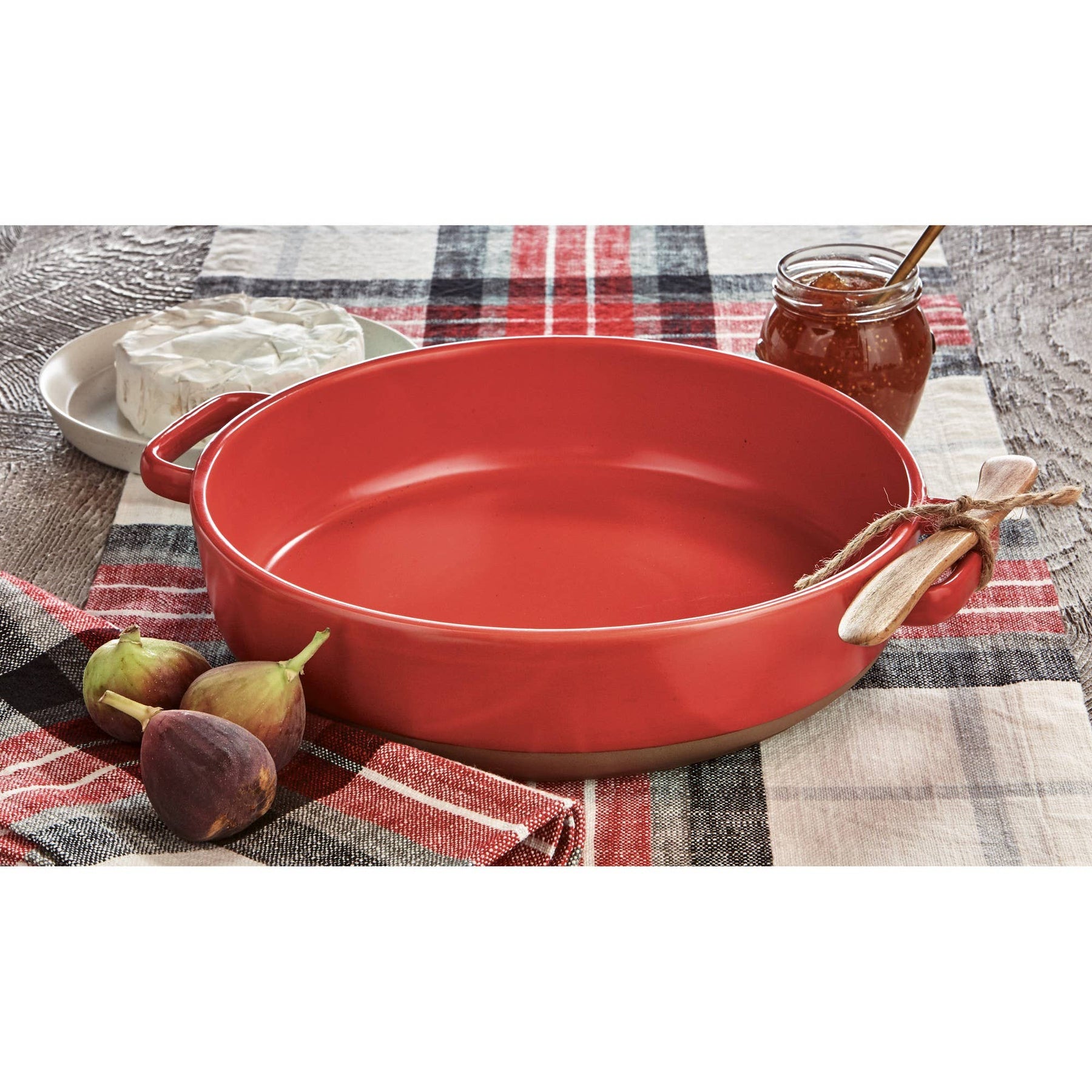 A convenient and large baking dish perfect for making popular brie centric dishes, dips, and appetizers. Perfect for entertaining! Features stoneware construction with exposed clay bottom, matte glaze, two handles, and beech wood spreader. Finished with a matte glaze and exposed clay bottom. Oven safe up to 480 degrees.