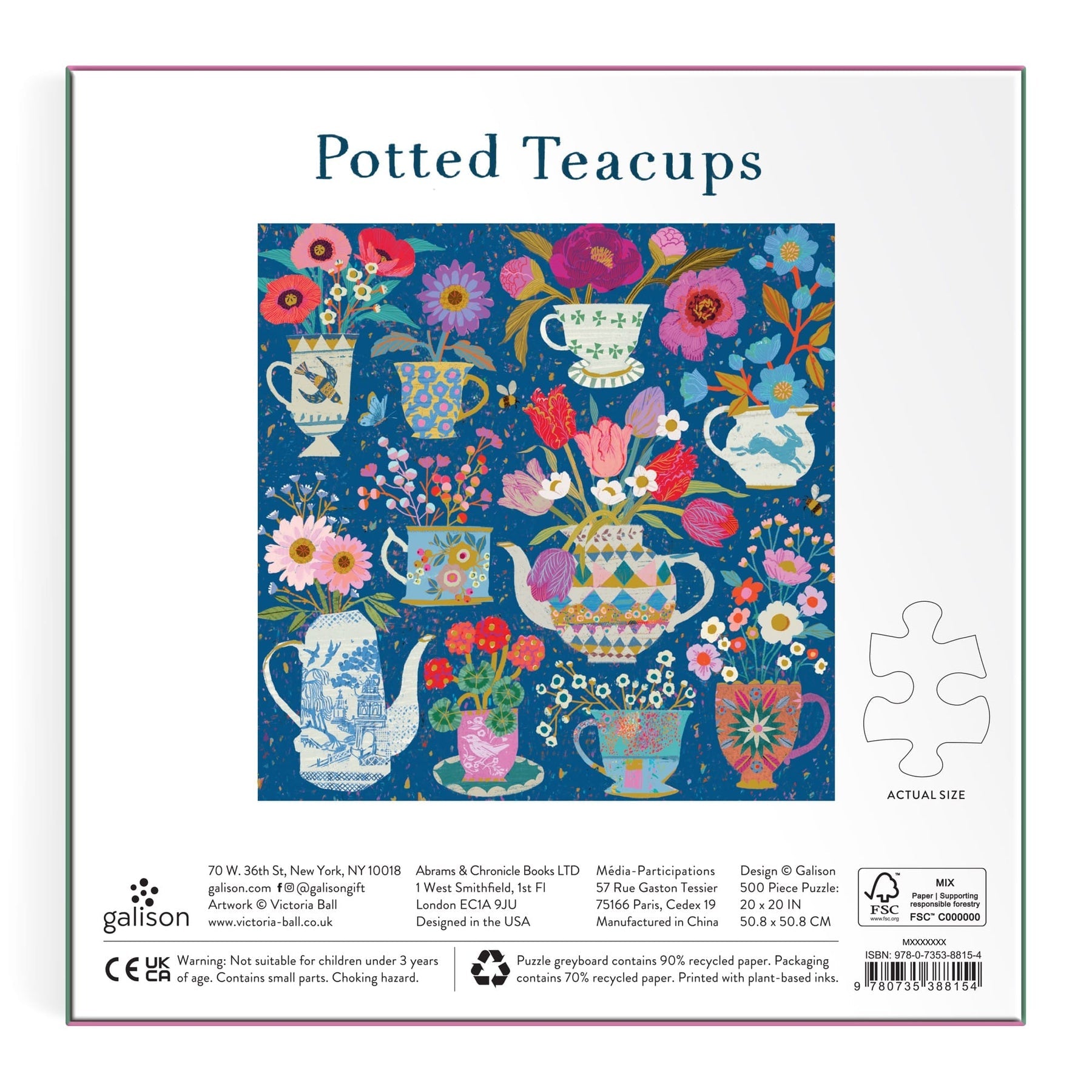 Discover whimsical charm with this 500-piece Galison foil puzzle by Victoria Ball featuring a variety of blooming flowers nestled in decorative teapots, mugs, and pitchers. The composition showcases Ball's vibrant palette set against a deep blue backdrop, with intricate patterns adorning each vessel. Luxurious foil accents shimmer throughout, adding dimensional elegance to the playful design.