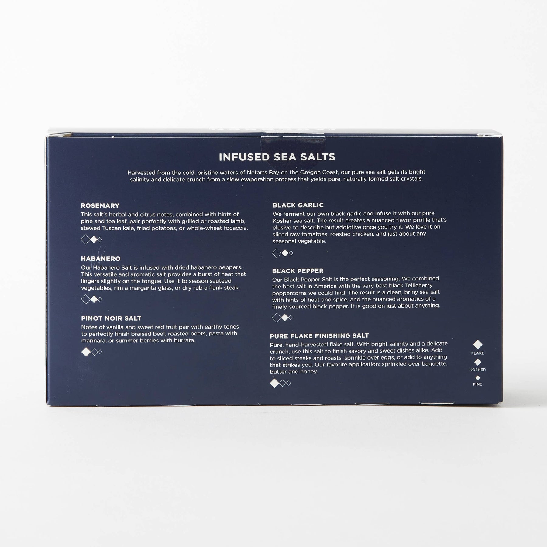 Harvested from the cold, pristine waters of Netarts Bay on the Oregon Coast, our flake and kosher sea salts have garnered worldwide favor for their beautiful presentation and pure taste by professional chefs and home cooks alike.