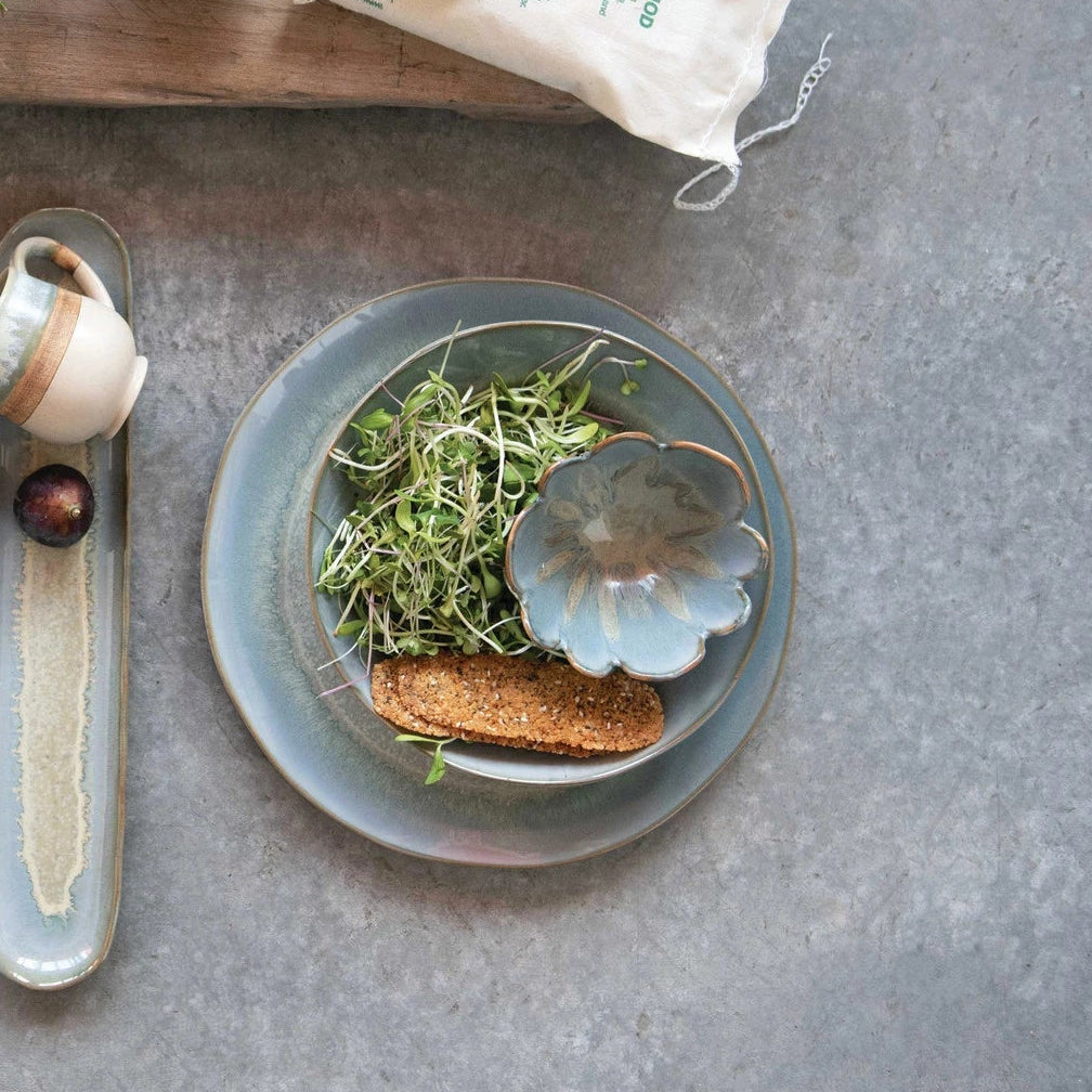 In the shape of a flower, this small dusty blue porcelain bowl will make a lovely statement in your kitchen or any room. At 4.5" round, it is ideal for serving snacks and sauces, or for holding trinkets. Would also be a nice decorative accent in your home.