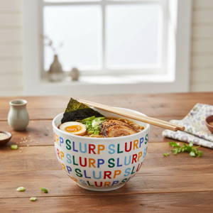 Elevate your noodle-eating experience with the SLURP Noodle Bowl Set, a delightful addition to your tableware collection. This charming set includes a set of bamboo chopsticks and a vibrant 16 oz stoneware bowl, adorned with the whimsical "SLURP" text. Perfect for enjoying your favorite noodles, soups, or rice dishes, these bowls are designed for everyday use and are dishwasher safe for easy cleanup. While the bowl can be conveniently washed in the dishwasher, the chopsticks require hand washing to maintain their quality.