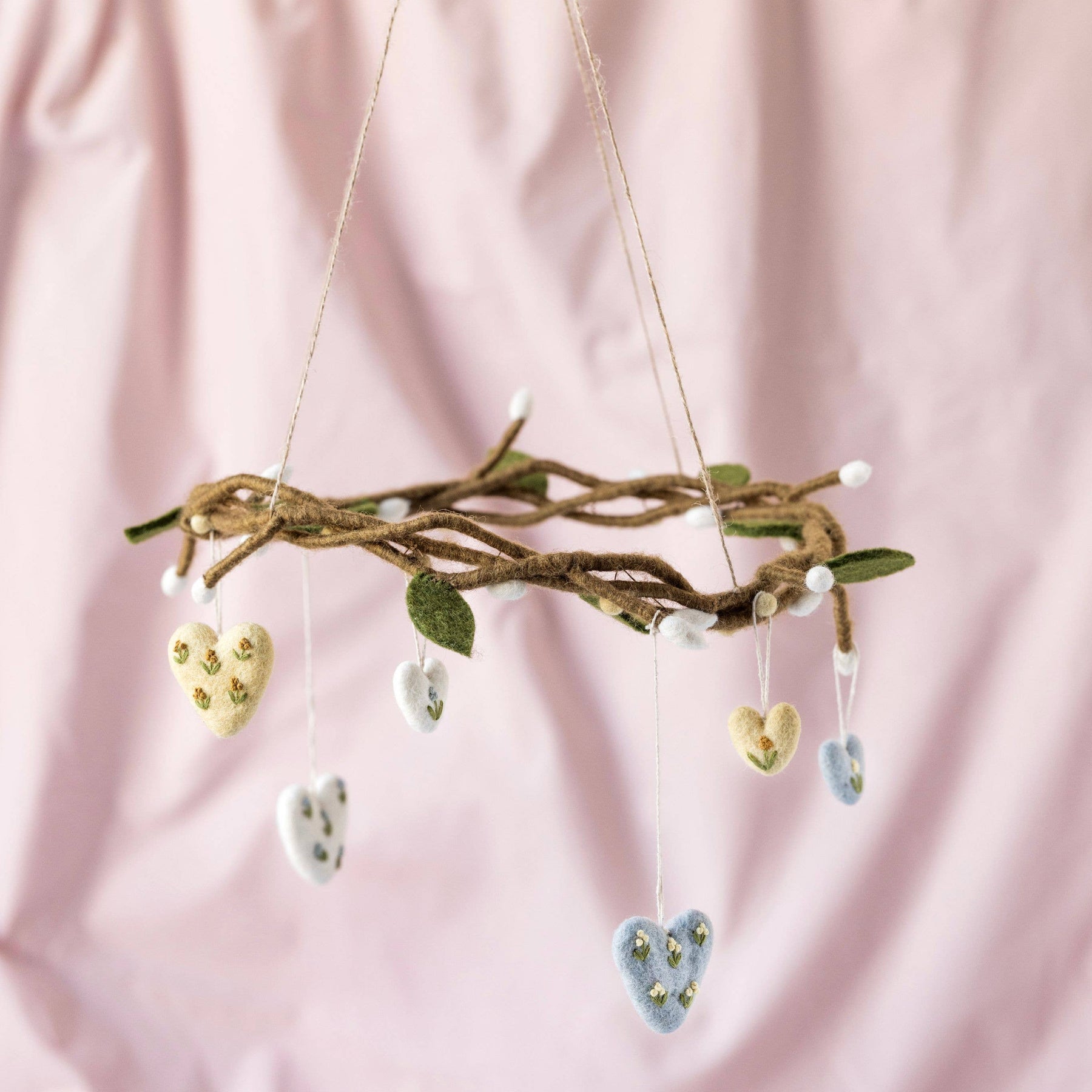 This tiny felted wool heart is stitched with a delicate flower and a whole lot of love. Hang it on a branch or tuck it into a gift.